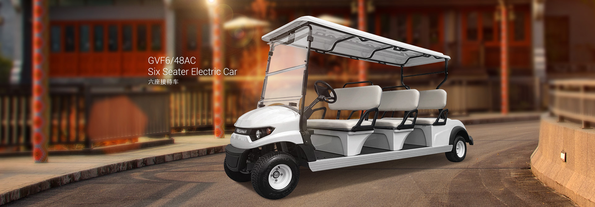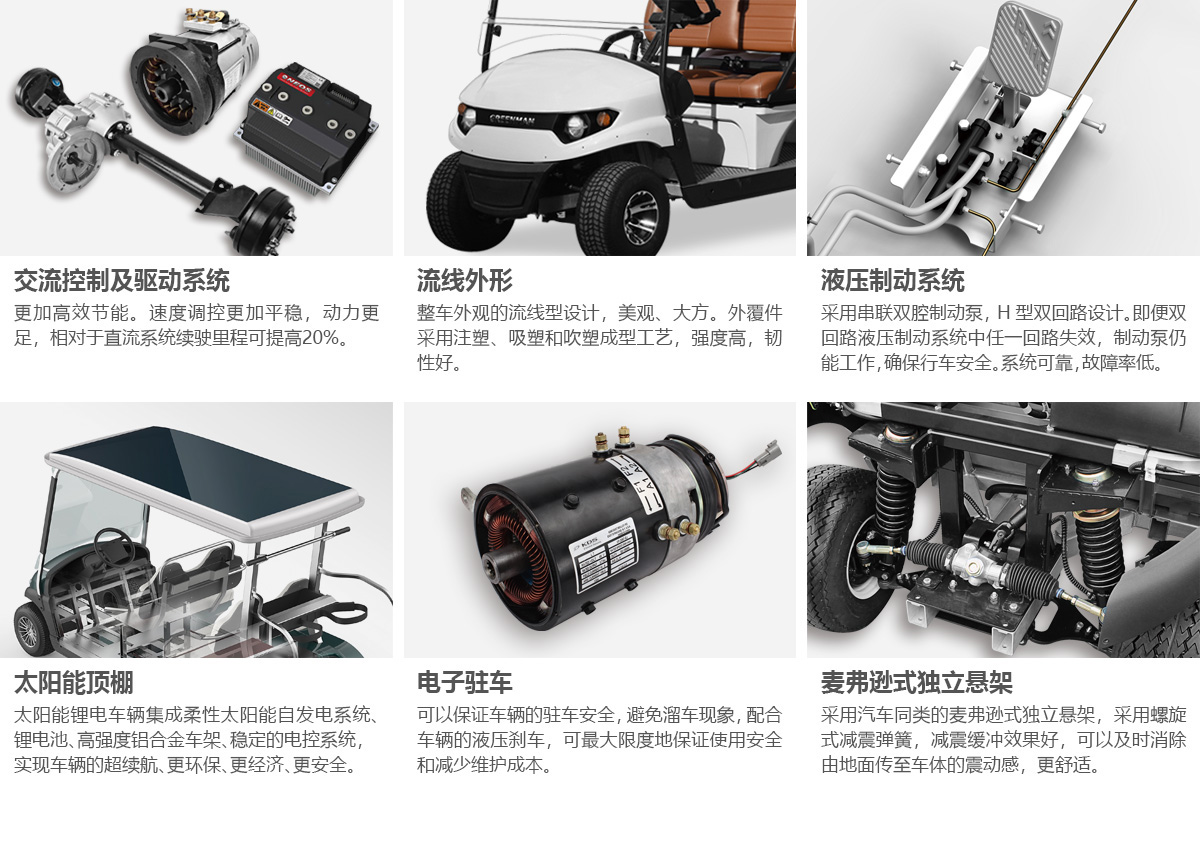 六座接待車性能穩定、操控輕便, 實用于高爾夫球場、大型游樂園、高檔酒店等。